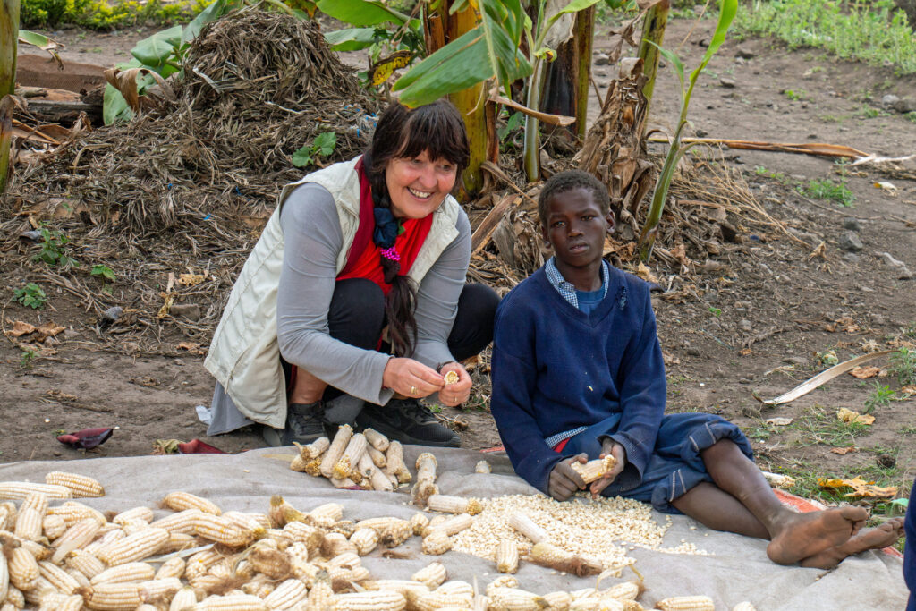 Bei ihren Besuchen überzeugen sich die Penns immer wieder, dass in den von ihrem Förderverein „Faraja heißt Trost“ unterstützten Einrichtungen alles gut läuft. Aber sie helfen vor Ort auch tatkräftig mit: Hier Marianne Penn bei der Maisernte.
