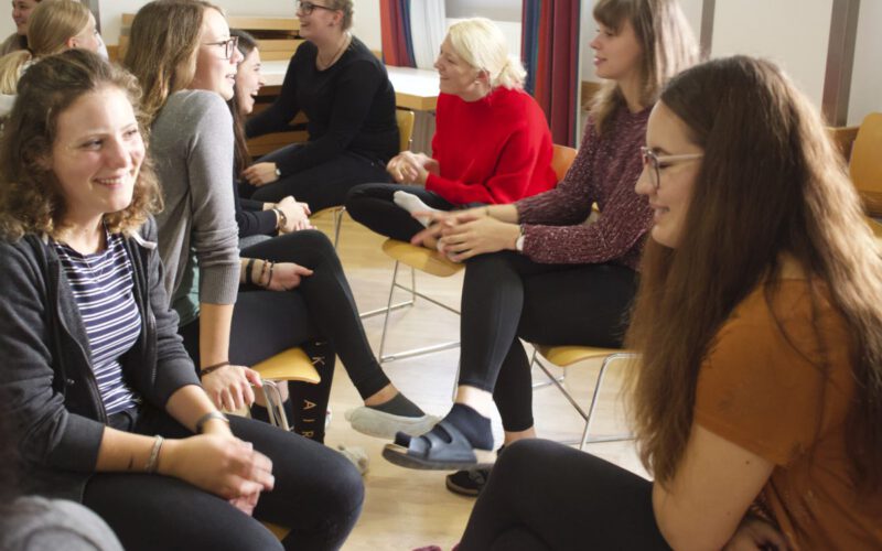 Eigentlich treffen wir uns in den Klassenzimmern, die einen sitzen an den Tischen, die anderen stehen am Pult, wir tanzen in der Aula, erkunden das Gelände um die Fachakademie, singen…