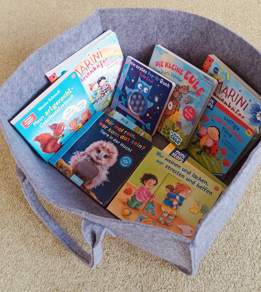 Mit unseren neuen „Bücher-Taschen“ sind wir jetzt mobil: flexibel von Raum zu Raum, in Krippen und Kindergärten.